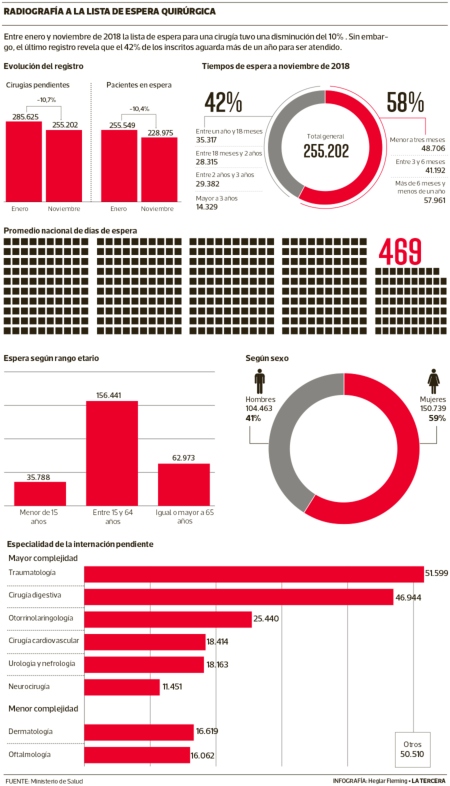 Sobre las nuevas cifras del repositorio, Óscar Arteaga, académico de la Escuela de Salud Pública de la U. de Chile y parte de la Comisión Asesora de Lista de Espera que convocó el gobierno pasado, explica que se trata de una disminución marginal: “La magnitud de la lista de espera, en personas y tiempos, se ha mantenido. En el informe de enero de 2018, que hicimos con datos de 2017, la mediana de espera era de 381 días, un poco más de un año”. Agregó que “las cifras reflejan que tenemos un tema estructural y se basa principalmente en una escasez de recursos y un déficit de camas” añadió.