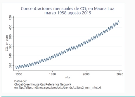 Esta línea ascendente con ciclo anual (oscilación estacional de fijación de carbono por fotosíntesis), es conocida como la curva de Keeling. Grafica la concentración de Dióxido de carbono en ppm en Mauna Loa (Hawai) desde 1958.