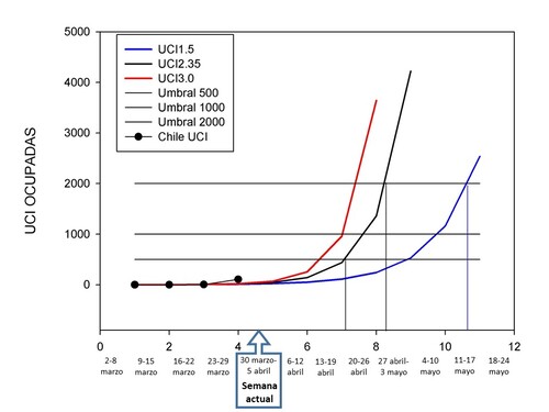 La Figura muestra la proyección de la necesidad semanal de camas UCI a largo plazo bajo distintos escenarios de R0(1) considerando una latencia de 1 semana entre el inicio de los síntomas y la necesidad de cama UCI (valor plausible pero arbitrario). El colapso se proyecta sobre la base de 500, 1.000 y 2.000 camas UCI para pacientes críticos de COVID-19. En el eje Y, se ha graficado la ocupación de camas UCI y en el eje X se ha graficado el tiempo en semanas transcurridas desde el primer caso. Los círculos negros corresponden a las camas UCI utilizadas, reportadas por el Ministerio de Salud.