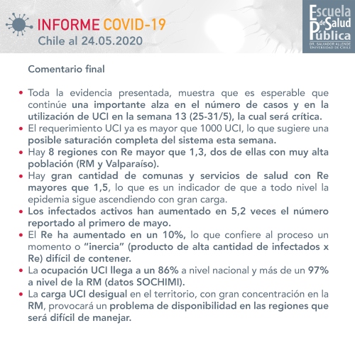 En el contexto de la pandemia por coronavirus (COVID-19), el profesor Mauricio Canals desde el inicio de la epidemia en Chile ha aportado información respecto proyecciones de la curva y demanda esperada en la atención de salud. Los reportes - inicialmente de circulación interna - han permitido seguir cercanamente el desarrollo de la epidemia en Chile y disponer de información relevante para su evaluación. Al reporte inicial, se han incorporado análisis propuestos por otros académicos y académicas de la Escuela y se ha complementado con datos a nivel regional.