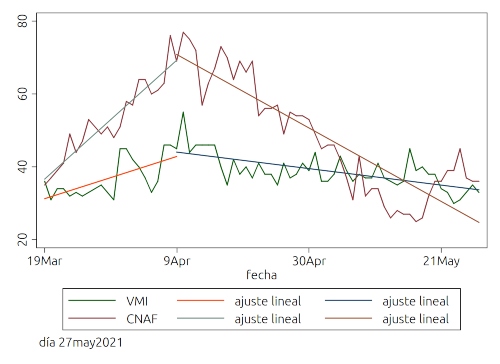 Adjunto mis dos joyitas: la serie de tiempo con la positividad poblacional (Figura 1) y el uso de Ventilación Mecánica (VM) y Cánula Nasal de Alto Flujo dentro del Hospital (CNAF) (Figura 2). Un enigma epidemiológico es que el máximo uso de CNAF fue el 10 de abril y al día siguiente registramos la mayor positividad poblacional de PCR.