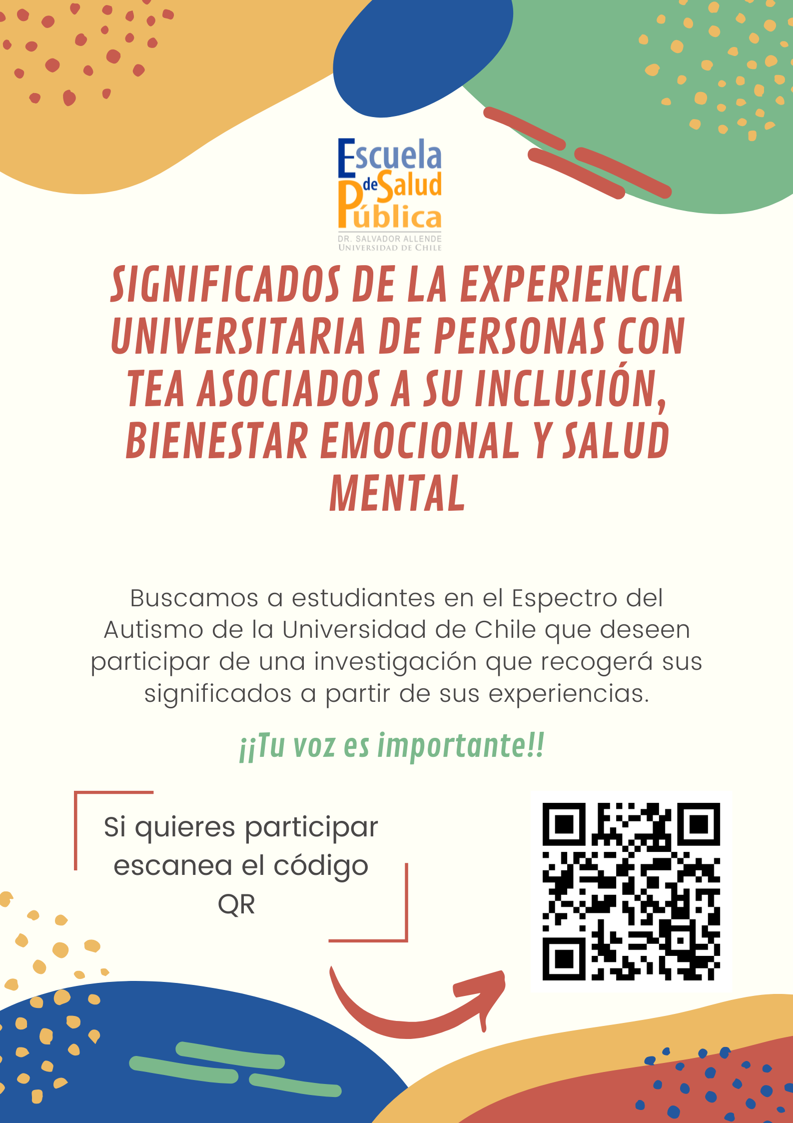 Si eres parte de los estudiantes con Diversidad Funcional de la Universidad que presenta Trastorno del Espectro Autista (TEA) y cursas 2º año o más, te invitamos a participar del estudio titulado “Significados de la experiencia universitaria de personas con TEA asociados a su inclusión, bienestar emocional y salud mental”.