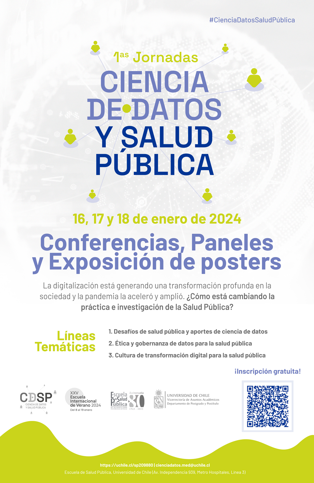 Las 1ras Jornadas de Ciencia de Datos y Salud Pública buscan reunir a estudiantes de posgrado, profesionales y académicos de las áreas de la salud, ingeniería, políticas públicas, ciencias sociales, y áreas afines para discutir sobre los cambios en el campo de la salud pública producto de la digitalización y la ciencia de datos, además de promover nuevas redes de contactos que permitan el desarrollo y colaboración en esta línea. Como resultado de las jornadas se publicará un libro digital de las presentaciones y trabajos seleccionados, que muestre el estado del arte en este campo.