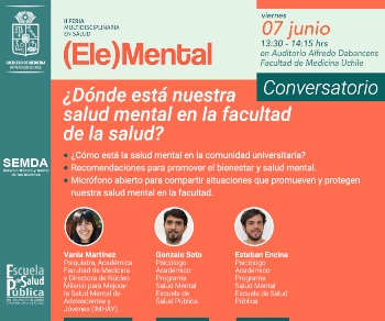 Como el tema es la prevención de la Salud, la ESp presentará el Conversatorio: ¿Dónde está nuestra salud mental en la facultad de la salud? A cargo de académicos de la Escuela de Salud Pública y de la Facultad de Medicina.