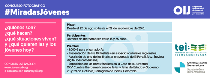 El Organismo Internacional de Juventud para Iberoamérica (OIJ) en alianza con el Programa de Cooperación Televisión Iberoamericana (TEIb) y la Asociación de Televisiones Educativas y Culturales Iberoamericanas (ATEI), y con el apoyo de la Secretaría General Iberoamericana, a través del Espacio Cultural Iberoamericano, convocan a los jóvenes de la región a participar en el concurso de fotografía Miradas Jóvenes.