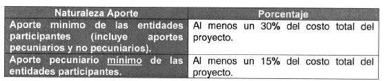 - Cofinanciamiento: Hasta el 70% del costo total de proyecto, con un tope hasta $90.000.000. El 30% restante debe cumplir con lo señalado en el siguiente cuadro: