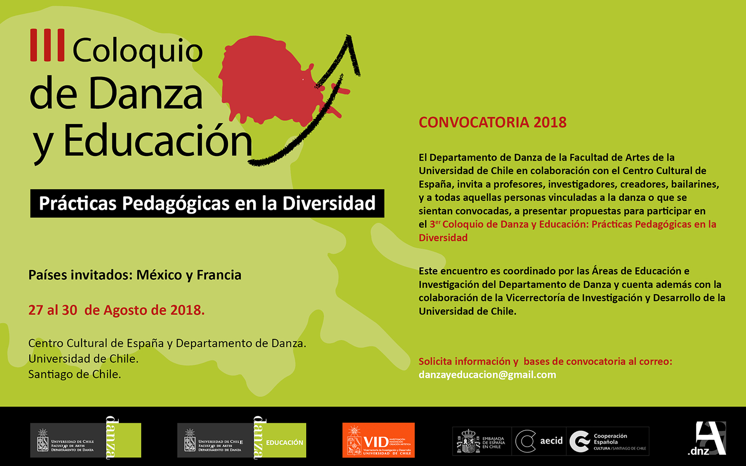 Todas las personas que se sientan convocadas e interesadas en participar en este tercer Coloquio de Danza y Educación, chilenos o extranjeros, deberán enviar sus propuestas, ya sean perfoconferencias o ponencias convencionales, al correo danzayducacion2018@gmail. El plazo es hasta el viernes 1 de junio.