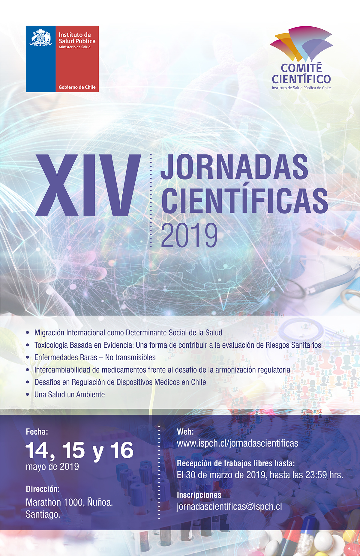 El Instituto de Salud Pública de Chile, como Institución Científico-Técnica del Estado, tiene el agrado de invitar a la XIV versión de las Jornadas Científicas que se realizará los días 14, 15 y 16 de mayo de 2019.