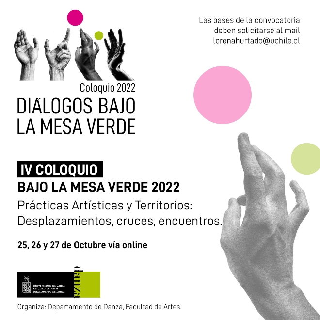 La cuarta versión del Coloquio Bajo la Mesa Verde, organizado por el Departamento de Danza de la Facultad de Artes de la Universidad de Chile, se orienta a visibilizar los territorios y las prácticas de la danza actual, con el fin de generar y compartir conocimientos.