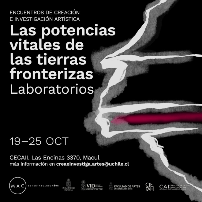 La Dirección de Creación e Investigación de la Facultad de Artes (CAI) y el Centro Interdisciplinario de Estudios en Filosofía, Artes y Humanidades (CIEFAH) de la Universidad de Chile, en colaboración con el Museo de Arte Contemporáneo (MAC), invitan a participar del 19 de octubre al 25 de octubre, del segundo momento de los Encuentros de Creación e Investigación Artística: Las Potencias Vitales de las Tierras Fronterizas, que consiste en la realización de seis Laboratorios de Creación e Investigación Artística.