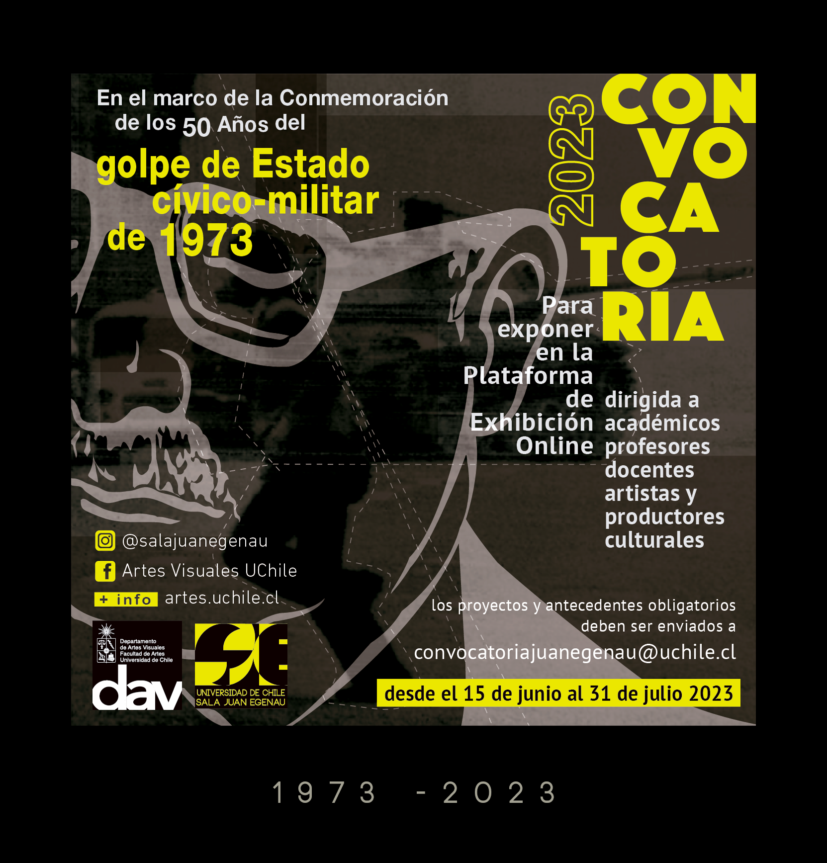 En el marco de la conmemoración de los 50 años del golpe de Estado en Chile, el Departamento de Artes Visuales, DAV, de la Facultad de Artes de la Universidad de Chile, abre convocatoria para exponer durante el segundo semestre 2023 en la plataforma de exhibiciones virtuales conocida como SJE “Relatos Visuales”.