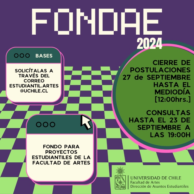 La Dirección de Asuntos Estudiantiles convoca al concurso FONDAE 2024 en su decimosexta versión, cuya convocatoria estará abierta a postulaciones hasta el día 27 de septiembre de 2024 hasta las 12:00h.