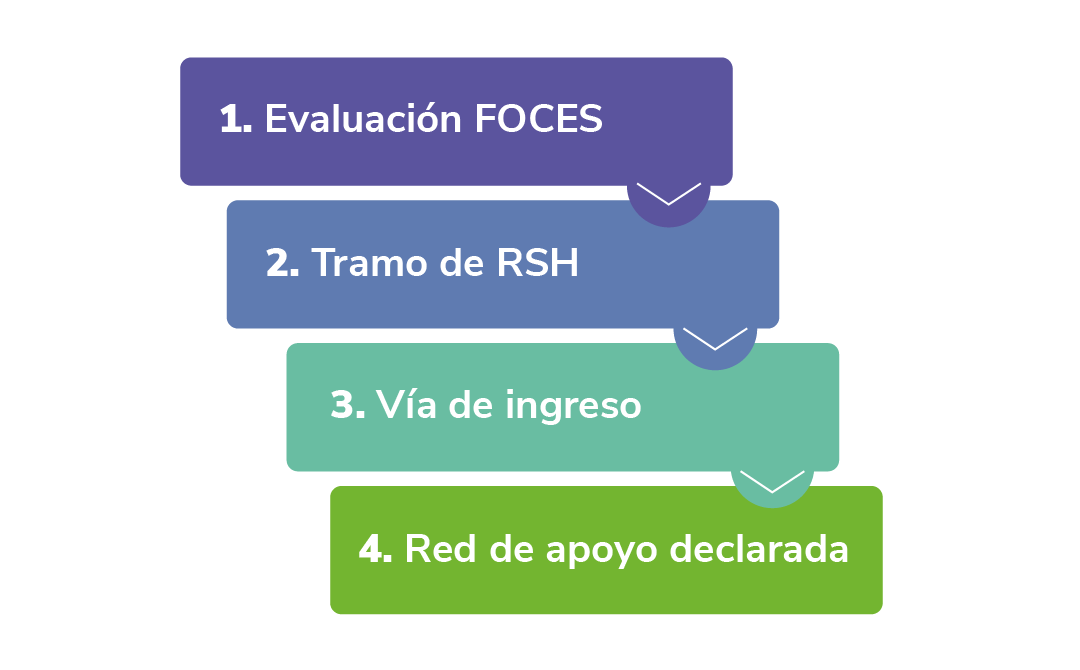 - Presentar situación de vulnerabilidad socioeconómica, de acuerdo a la acreditación interna a través de FOCES y consistente con Registro Social de Hogares del Ministerio de Desarrollo Social, actualizado en la comuna de residencia del/la estudiante y su grupo familiar.