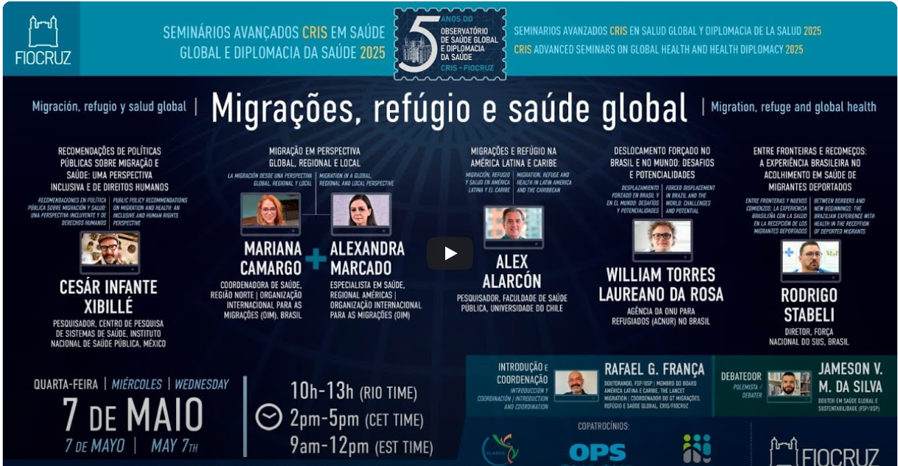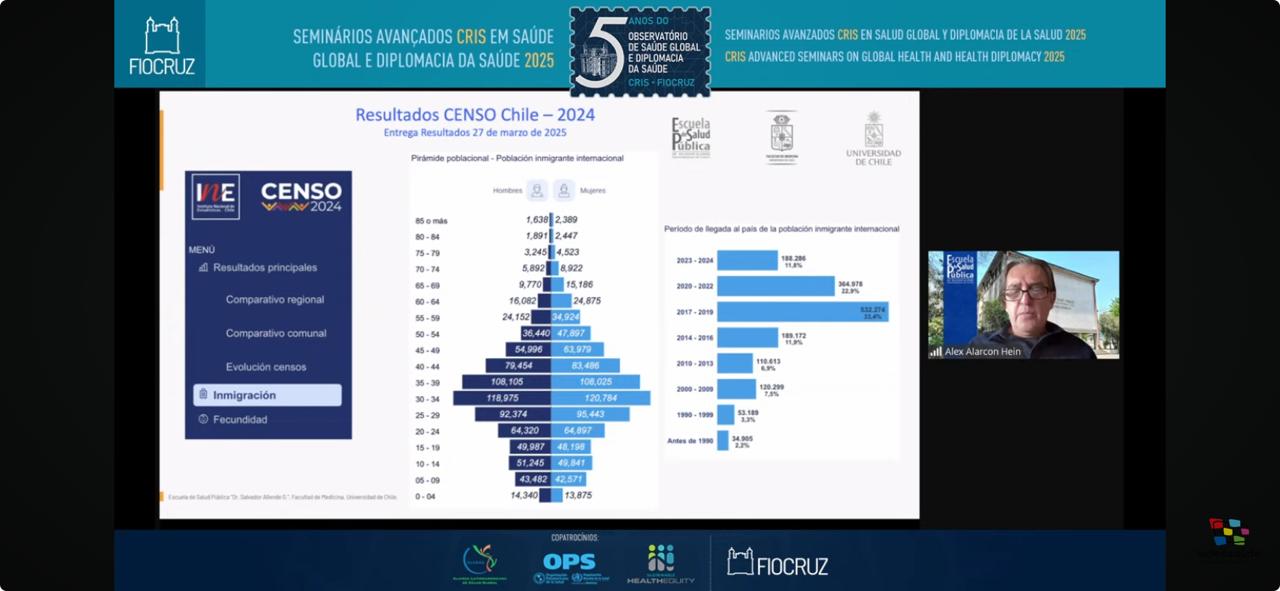 La edición número 112 del Seminario Avanzado de Salud Global y Diplomacia en Salud, organizado por el Centro de Relaciones Internacionales en Salud de la Fundación Oswaldo Cruz (CRIS/FIOCRUZ), abordó el tema “Migración, refugio y salud global”, y contó con la participación del profesor Alex Alarcón, Jefe del Programa de Salud Global de la Escuela de Salud Pública de la Universidad de Chile. La actividad que fue realizada el pasado 07 de mayo, en modalidad virtual, reunió a representantes de organismos internacionales como ACNUR y OIM, además de expertos y expertas del continente.