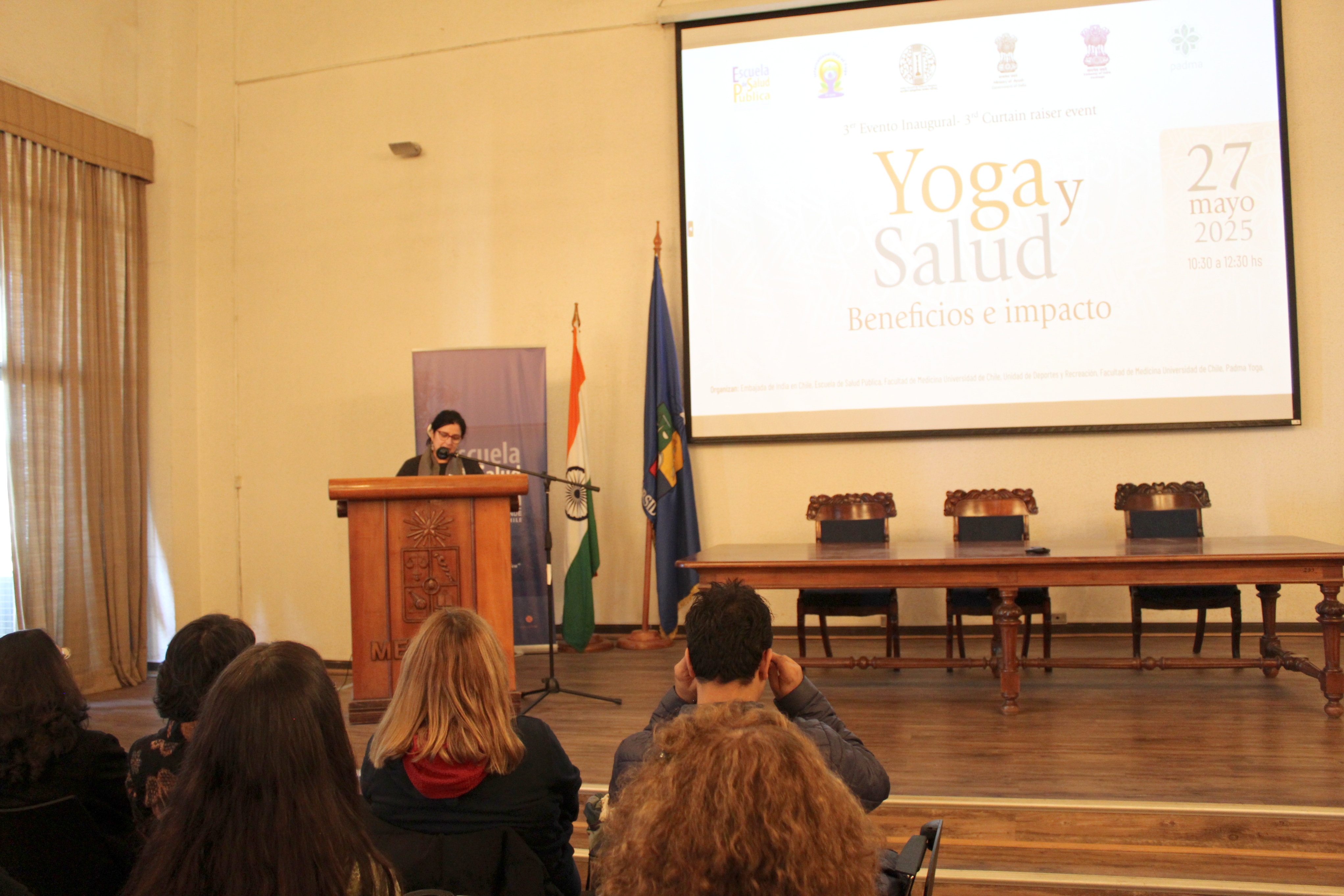 Con cerca de un centenar de asistentes y la participación de representantes diplomáticos, autoridades universitarias, académicas, profesionales de la salud y estudiantes, se desarrolló el pasado martes 27 de mayo de 2025 el evento “Yoga y Salud: Beneficios e Impacto”. Esta jornada fue organizada por la la Escuela de Salud Pública de la Universidad de Chile junto a la Embajada de la India en Chile, la Unidad de Deportes y Recreación de la Facultad de Medicina y el centro Padma Yoga & Mindfulness, como parte del ciclo de actividades previas a la conmemoración del Día Internacional del Yoga 2025.