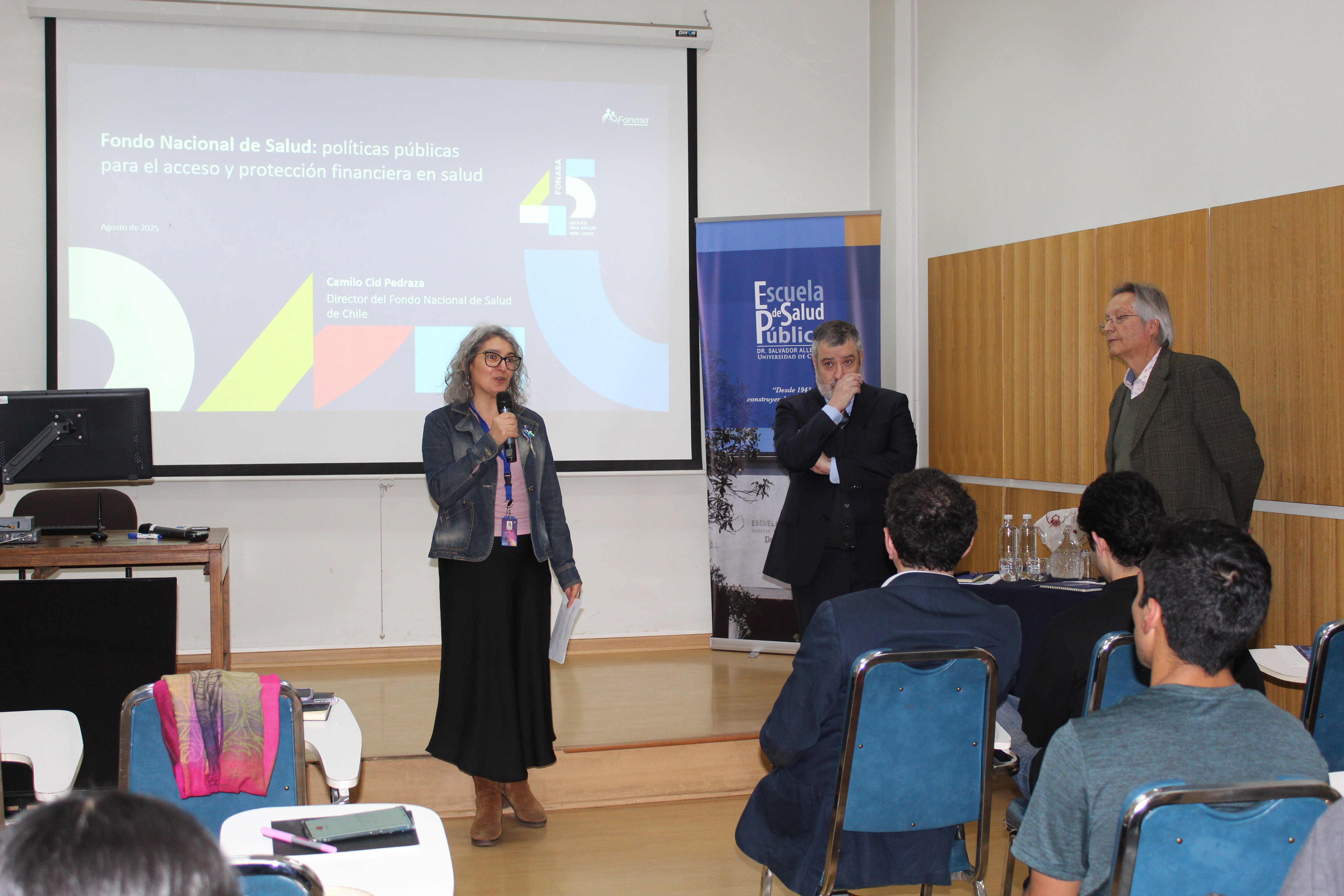 La coordinadora académica del Doctorado en Salud Pública, Alejandra Fuentes-García, dio la bienvenida a los asistentes presenciales y virtuales: “ En nombre del programa, estamos muy complacidos de contar con un invitado clave en términos de financiamiento de las políticas públicas, como es el Dr. Camilo Cid, director de FONASA”.