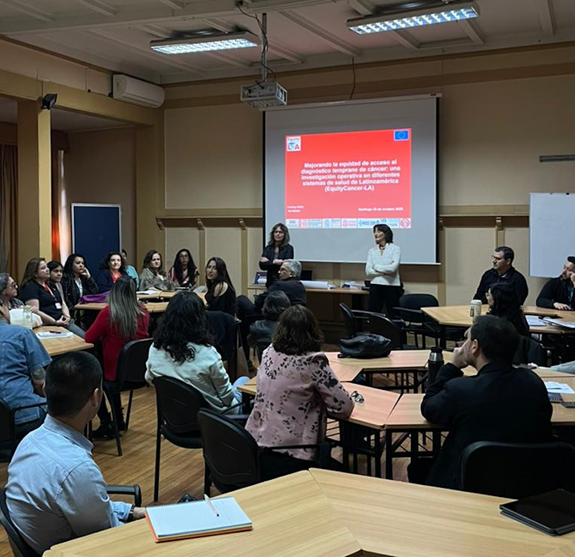 La jornada comenzó con la exposición de la Dra. María Luisa Vázquez, directora del Servicio de Estudios y Prospectivas en Políticas de Salud del Consorcio de Salud y Social de Cataluña y coordinadora general del proyecto Equity Cancer-LA, quien presentó los elementos centrales del proyecto y los resultados de línea de base de los tres países participantes (Colombia, Ecuador y Chile).