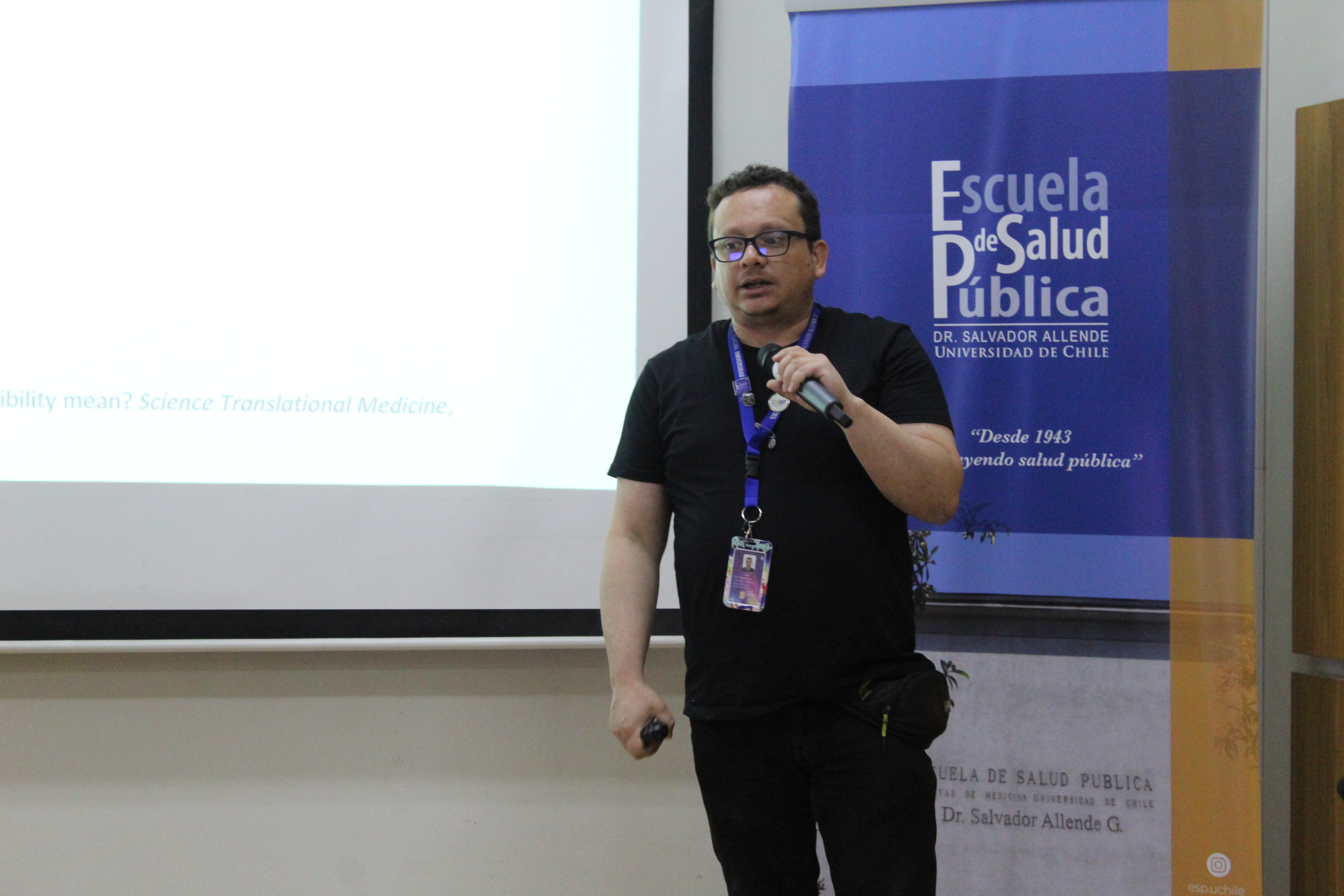 La jornada abrió con las palabras del académico Mauricio Fuentes, quien relevó el origen del encuentro: “Es una alegría poder comenzar esta actividad que esperemos sea la primera versión de esta serie de coloquios que hemos llamado Datos y Relatos. Esta fue una idea que surgió de nuestros estudiantes del Magíster en Bioestadística, quienes organizaron un coloquio más íntimo, pero que inspiró esta versión ampliada junto al Grupo de Ciencia de Datos para la Salud Pública”. Además, subrayó el valor de sostener estas discusiones en la Escuela: “Sería bueno pensar en cómo podemos empezar a involucrar la reproducibilidad en nuestro diario académico; algunos lo hacen más que otros, pero debemos avanzar para que sea parte natural de nuestro trabajo”.
