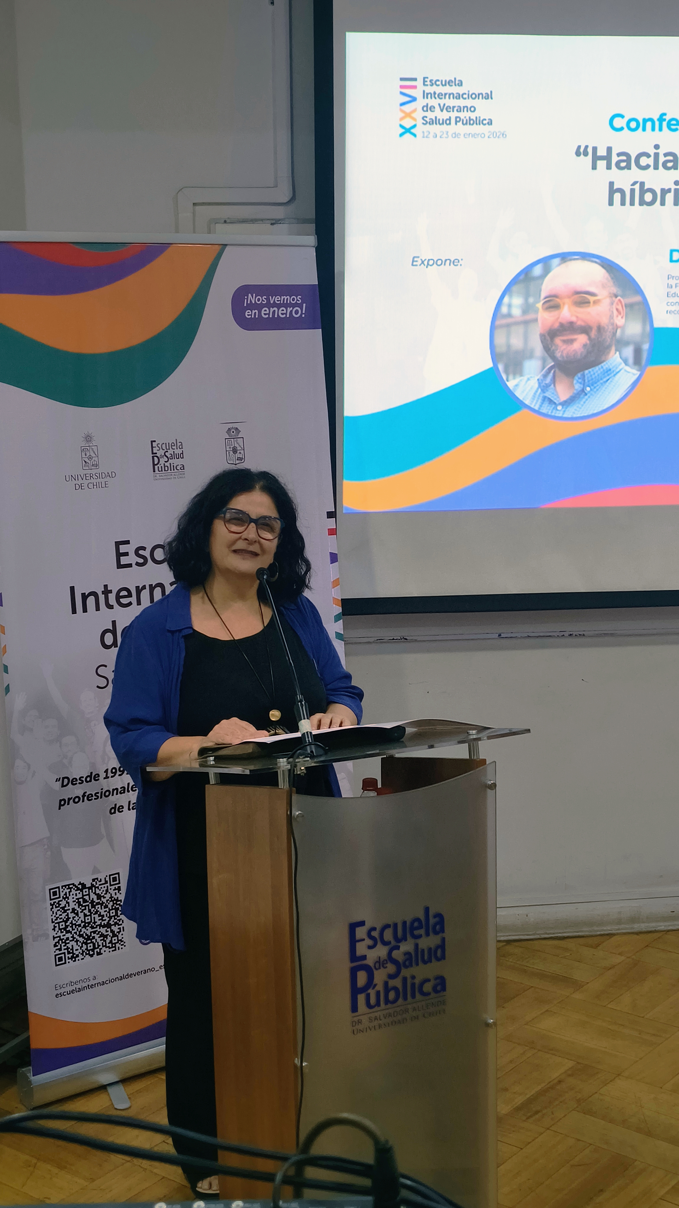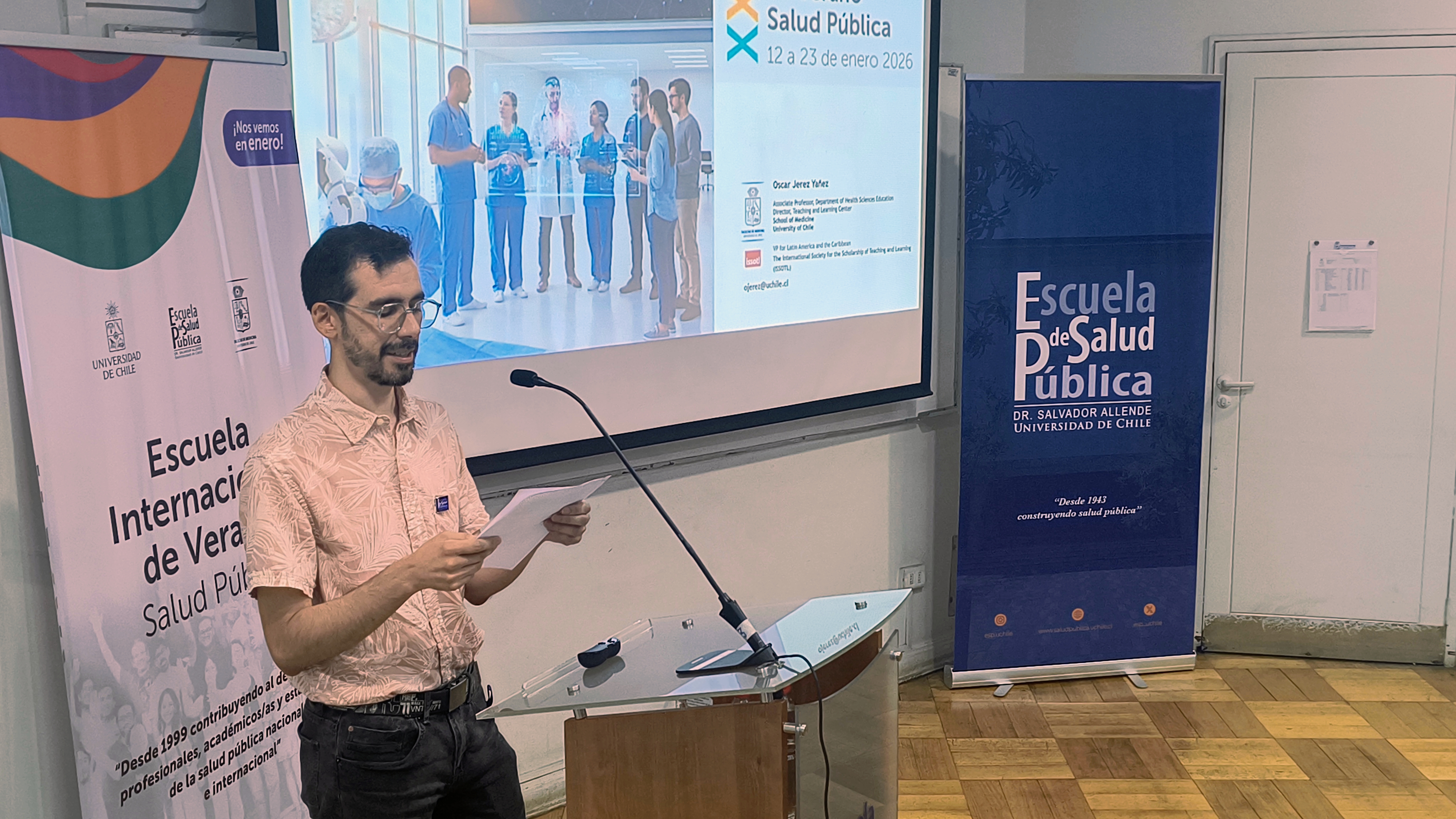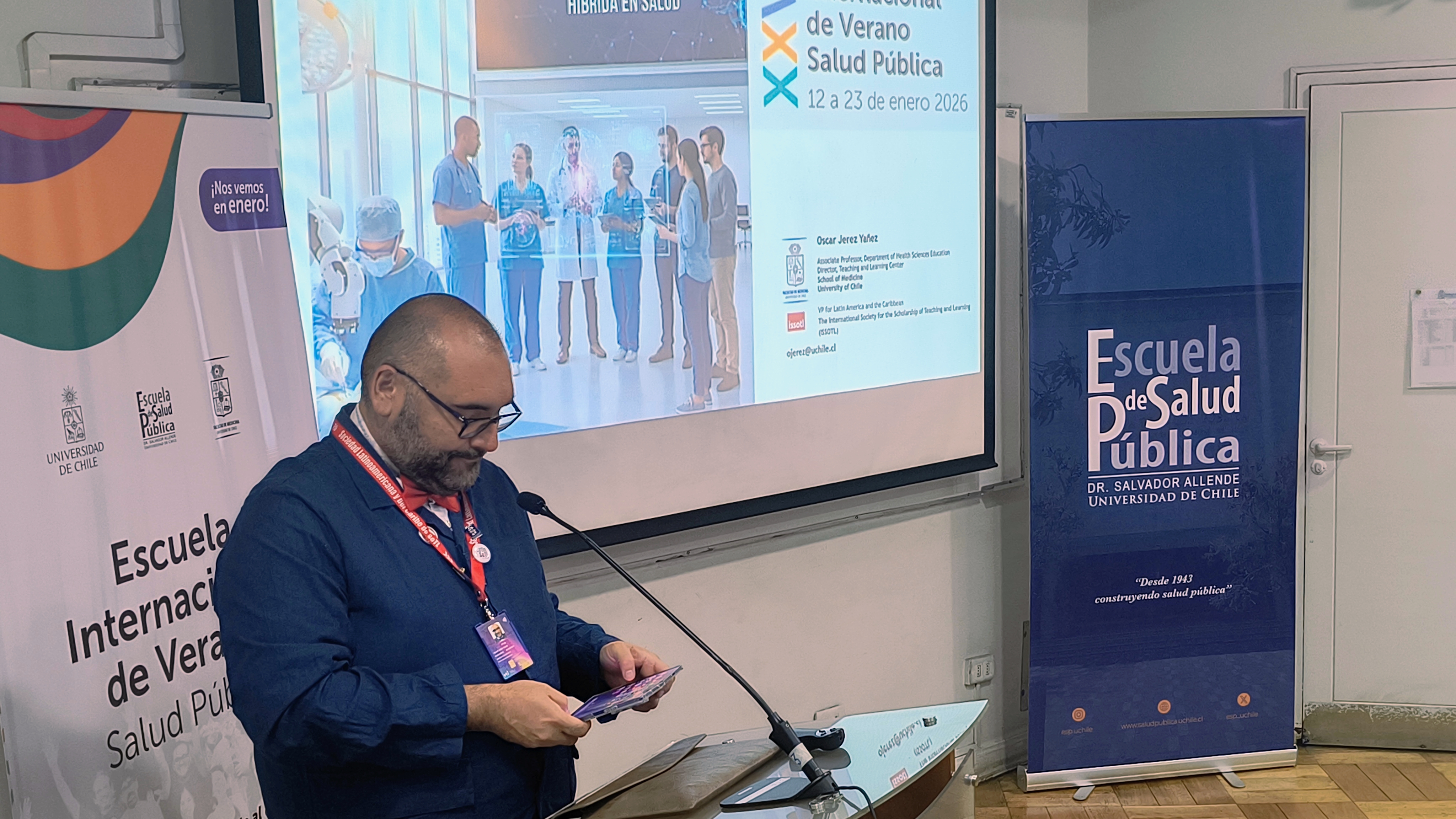 El 13 de enero recién pasado fue la inauguración de la XXVII Escuela Internacional de Verano (EIV) organizada por la Escuela de Salud Pública de la Facultad de Medicina de la Universidad de Chile. La ceremonia contó con la participación de la Dra. Lorena Rodríguez Osiac, Directora de la Escuela de Salud Pública; la Profesora Marinella Mazzei, subdirectora; el Profesor Felipe Medina, coordinador académico; el Dr. Emilio Herrera, Director del ICBM; y el Dr. Oscar Jerez Yáñez, académico del Departamento de Educación en Ciencias de la Salud de la Facultad de Medicina y conferencista de la jornada, autoridades la Facultad, estudiantes y profesores nacionales y extranjeros.